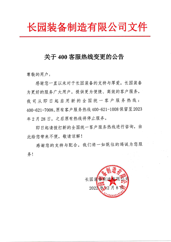 尊敬的用户: 感谢您一直以来对于长园装备的支持与厚爱,长园装备为更好的服务广大用户,提供更为便捷、高效的客户服务,我司从即日起启用新的全国统一客户服务热线:400-621-7008,原有客户服务热线400-621-1008保留至2023年2月28日,之后原有热线将停止服务。 即日起请拨打新的全国统一客户服务热线进行咨询,由此给您带来不便,敬请谅解! 感谢您的支持与配合,我们将一如既往的竭诚为您服务!